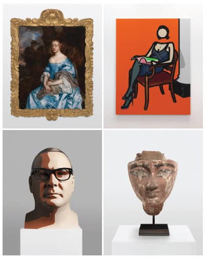 Another surprise in the show is Opie’s personal collection of art which includes sculpture from ancient Egypt and Rome, 17th and 18th century paintings and sculpture (works by Lely, Reynolds and Romney) and Japanese prints. Items from his collection occupy half of the display in the Holburne, juxtaposed with the other half which consists of works by the artist since about 1995 (Lely’s Portrait of an unknown woman, Opie’s At home with Maria 2, 2011, below left and right):